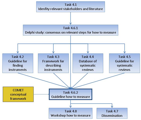 Two telephone meetings have been held among the partners to work out a strategic plan for WP4 (see Figure). Tasks 4.1, 4.6 and 4.8 have been started. The main task of WP4 was defined as the development of a guidance for instrument selection for COS (task 4.6.2). A Delphiprocess will be performed to achieve consensus on the relevant components of this “how to measure” guideline (task 4.6.1). As input for this Delphi process a search strategy is being developed by a research librarian to identify relevant papers that describe methodology for the selection of measurement instruments for outcomes included in a COS (task 4.1). The search will be performed in the Cochrane database of systematic reviews, Cochrane database of methodology reviews, Medline, CINAHL, Embase, and PsycINFO. In addition, apreliminary list of relevant stakeholders have been drafted and will be augmented using a “snowball sampling” approach. Stakeholders will be invited to participate in the Delphi process. A preliminary version of a “how to measure” workshop (task 4.8) have been drafted. This workshop will be given at the 3rd COMET meeting June 2013.